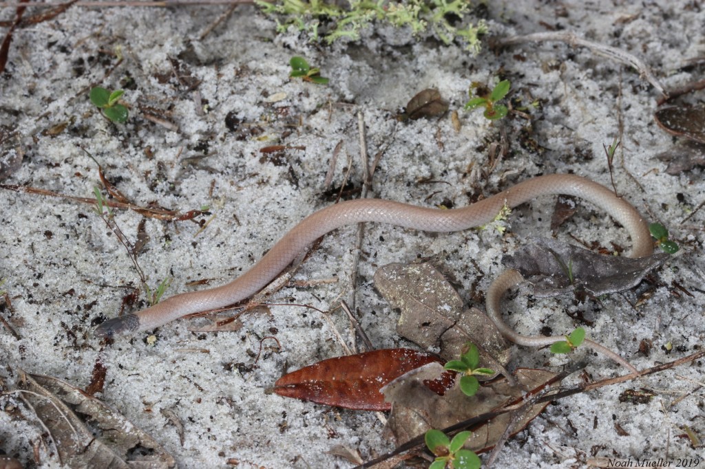 Crowned snakes are tiny, slender snakes that only attain an adult length of 8 inches. They are light colored with a head and back of the neck that are black. They look almost identical to the Southeastern Crowned Snake, but that species does not occur in our neighborhood and is found in the Florida panhandle and northward into the eastern US. Crowned snakes are fossorial and infrequently seen. They are most often encountered under rocks and logs and are thought to be primary prey of the Short-tailed Snake.