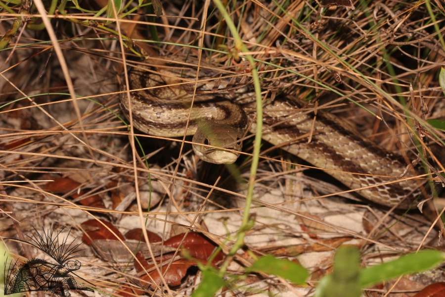 Rat snakes are large (up to 5 feet long), non-venomous snakes that occur throughout Florida. The color pattern of rat snakes is extremely variable with some being completely yellow, some being yellow with black stripes, some being gray with dark saddles, and others being a mix in between. Scientists are currently examining the taxonomy of rat snakes because the color variation appears to be separated geographically too. The rat snakes in our neighborhood have a yellow color and four dark stripes that run the length of the snake. Rat snakes can be found in almost any habitat that has abundant prey such as lizards, frogs, rodents, rabbits and birds. Because of their adaptability, they are frequently seen around farms and residential areas.